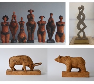 Zugegeben, den Titel „EveryBody - Der Körper als Zeichen“ habe ich vom Kunstmuseum Mühlheim übernommen. Ich fand ihn für das keramische Arbeiten überaus anregend. Schon in meiner Serie „Bikini-Mädchen und Urmütter“ standen die Figurinen für Jugend und reifes Alter. In „Hocken, Sitzen, Thronen“ kamen verschiedene auch unerwartete Seins-Zustände zum Ausdruck, wie Introvertiertheit, Entspanntheit, Verschlossenheit, Neugier usw. Selbst wenn es um abstrakte Formen wie eckig und rund geht, fühlen wir etwas. Lasst uns Klischees hinterfragen und unterwandern. Wisst ihr, wofür die beiden Tiere unten stehen (an der Börse)? Dann wisst Ihr auch, wie ich die Bedeutung unterwandert habe. Zunächst aber werde ich Euch alle technischen Möglichkeiten zeigen. Danach folgt eine erste Übung zur Ideenfindung, dann setzen wir die beste Idee in der von Euch gewählten Technik größer um.
